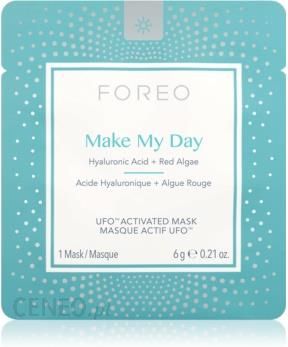 WSZYSTKO, CO NAJLEPSZE DLA TWOJEJ SKÓRY Zmien 20-minutowe, nieruchome lezenie z maseczka na twarzy w 90-sekundowa przyjemnosc! Kazda z maseczek zostala zaprojektowana tak, aby wspólgrac z unikalnym zabiegiem UFO oraz zapewnic piekna i rozswietlona cere od rana do nocy. Make My Day maseczka aktywowana przez UFO zawiera kwas hialuronowy i ekstrakt z czerwonych alg, które pomagaja w glebokim nawilzeniu, ochronie przed zanieczyszczeniem i zachowaniu pieknego blasku skóry. 90-SEKUNDOWA KURACJA Kuracja maseczka Make My Day aktywowana przez UFO rozpoczyna sie od 30 sekundowej termoterapii i terapii czerownym swiatlem w celu przygotowania skóry do dalszych zabiegów poprzez otworzenie porów i rozpulchnienie skóry. Kolejne 30 sekund to dzialanie pulsacji T-Sonic, które zwiekszaja wchlanianie skladników aktywnych przez skóre. Przez ostatnie 30 sekund zielone swiatlo LED i pulsacje o nizszej czestotliwosci odswiezaja skóre i wyrównuja jej koloryt. PRZYSZLOSC W SWIECIE MASECZEK Ultramiekka, wykonana z mikrofibry maseczka Make My Day gwarantuje nieskazitelny wyglad cery od switu do zmierzchu. Wspólgra z unikalna aplikacja mobilna FOREO. Maseczka wykonana rankiem pobudza, odzywia i rozswietla skóre. Nawilzanie i oczyszczanie – skóra jest lepiej nawilzona, odswiezona i zadbana Kwas hialuronowy wprowadza skladniki aktywne w glab skóry i idealnie ja nawilza Bogate w przeciwutleniacze czerowne algi chronia skóre przed szkodliwymi wolnymi rodnikami i tworza bariere przeciw zanieczyszczeniom Dziala wylacznie z urzadzeniem UFO lub UFO mini od FOREO Naturalne i bezpieczne dla zdrowia skladniki – nie zawiera parabenów, fenoksyetanolu, alkoholu lub disodium EDTA