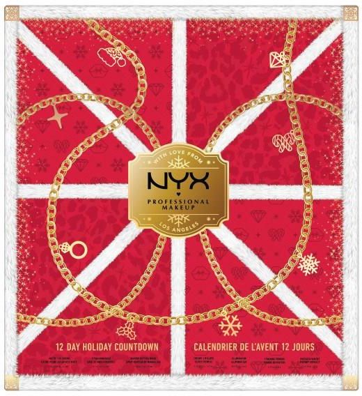 Kalendarz adwentowy NYX Professional Makeup Mrs Claus 12 Day Holiday Countdown zawiera limitowane połączenie bestsellerowych kosmetyków do makijażu.